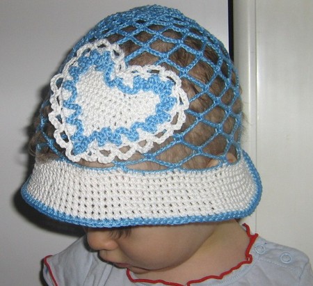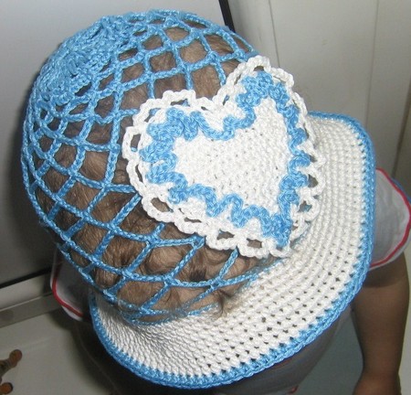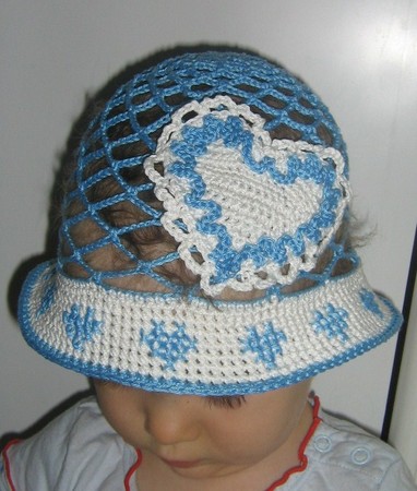 Шапочка голубая с сердечком... сама шапка связалась за 2 часа, а вот поля и сердечко- полдня делала, хочу на полях еще сердечки крестиком вышить(там получилась идеальная канва), но тк никогда не вышивала, не знаю как, буду просить помощи у наших вышивальщиц...