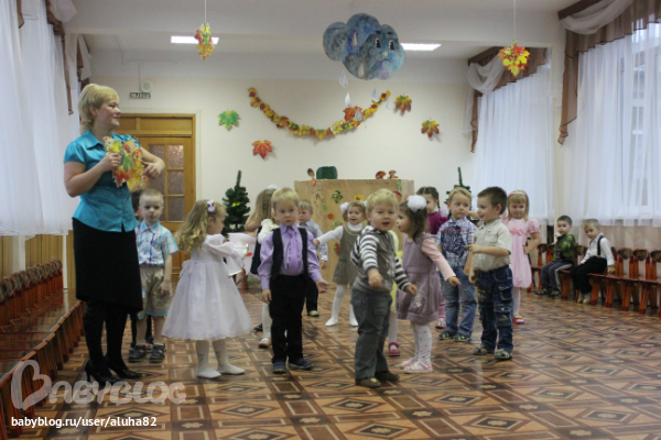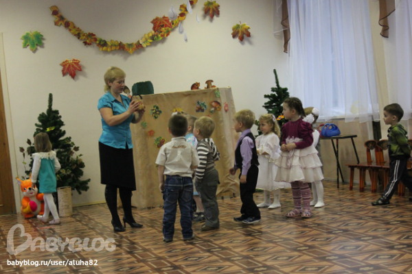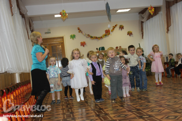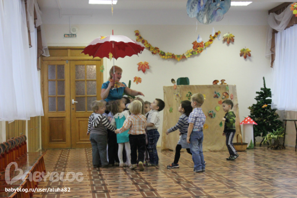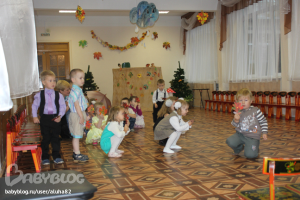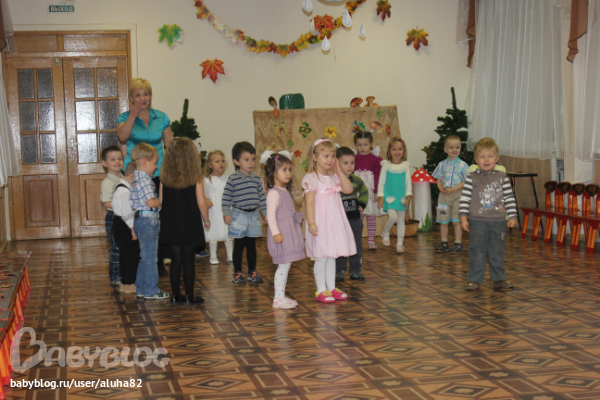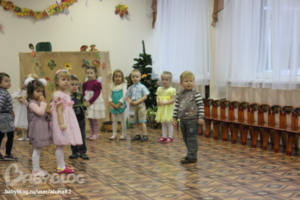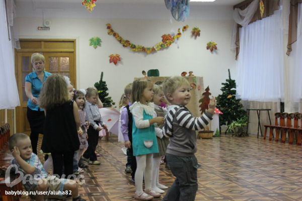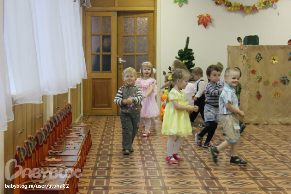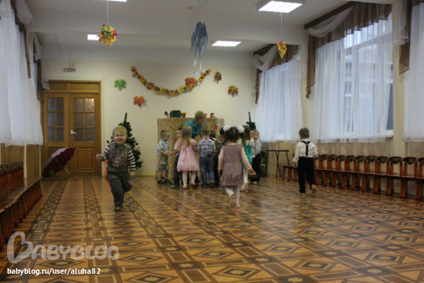 ПРаздник осени проводился в актовом зале. Детишки заходили в зал такие довольные, правда как только увидели родителей (а нас было много), несколько детишек побежали к нам. Я боялась такой реакции и от своего зайченыша. Думала, что как прибежит ко мне, так и все, весь праздник на смарку. А тут ведь мы еще и на больничном сидим, поотвыкли чуть-чуть. На праздник нам разрешили придти. А точнее очень попросили придти.