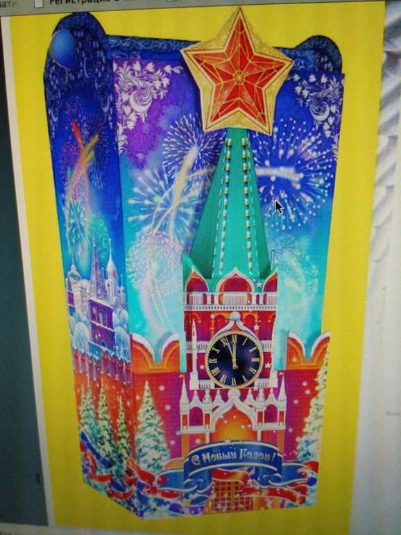А любимому мужу вот такой вот кремль - огромная картонная коробка с блестками, глянцевая))) высотой 44 см! за 87р. Положу туда термобелье ))) не дает сохранить рисунок! сфоткала с экрана