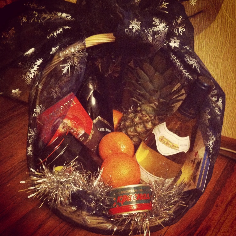 Собрали корзины: вино, шампанское/коньяк, ананас, икра, шоколад, конфеты, чай/кофе, мандарины