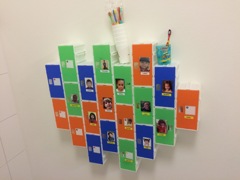 У каждого малыша есть свой шкафчик с зубной щеткой, стаканчиком и зубной пастой. На шкафчике имя и фото ребенка. Мы на момент фото еще свою мордашку не приклеили...