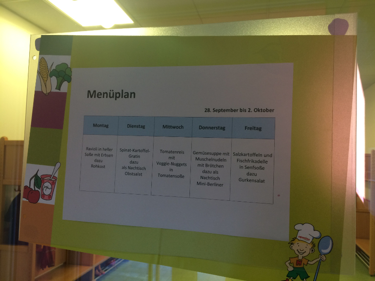 Садик вегетарианский. Есть завтрак, обед и полдник. Обеды на неделю вперед вывешиваются для родителей на входной двери. Завтрак и полдник в подробностях не описываются, но обычно в них входит: мюсли, йогурт, хлеб разного вида, хлебцы, намазки, сыр нарезка, огурцы, болгарский перчик - нарезанные, яблоки, бананы и др. фрукты, печеньки и даже каштаны :)) вода, молоко, компот. Меню чередуется. Еда проходит по системе шведский стол: пришел, взял тарелку, чашку, приборы, положил себе всего чего и сколько хочешь, сел, поел. Всё совсем по-другому, чем в российских садиках. Непривычно)) Но объясняют тем, что ребенок так приучается к самостоятельности. Разумеется, если кто-то ест плохо, его с ложечки покормят, но мюсли в тарелочку сыпать не будут - сам, пожалуйста, бери ложку и вперед!))