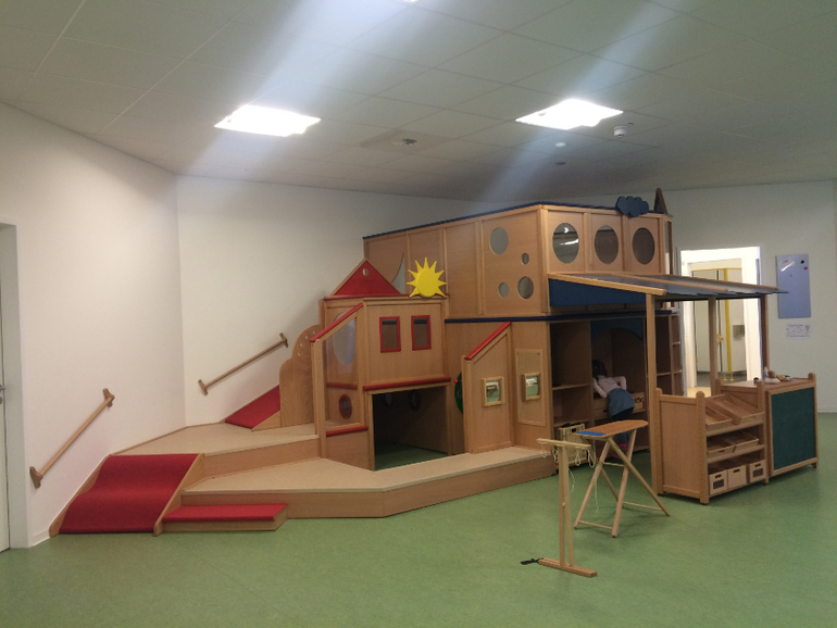 После завтрака дети собираются в группе и у них начинаются поделки: рисуют, клеят... Далее - музыка. Они идут в мьюзикрум, садятся по кругу на маты поют песни. Потом идут гулять. Гуляют все группы вместе на одной площадке. Все общаются, играют вместе. Затем обед. После которого дети чистят зубы и идут играть например в другую группу, в другие игрушки.