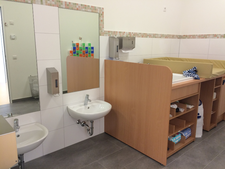 Туалетная комната для деток. Если ребенок пользуется подгузниками - здесь ему всё без проблем поменяют. В каждой группе - по два пеленальных столика.