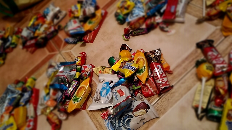 Конфеты покупала в развес в гипермаркете, конструкторы для детей покупала в детском мире, причем цена в интернет магазине была немного ниже, чем в розницу. Плейдо покупала 60% в интернет магазине ОГО, оставшиеся по штучно в разных магазинах (и они были намного дороже чем через инет). Мешочки покупала на интернет портале ярмарка мастеров