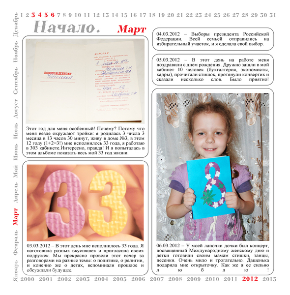 СтраницыНасмотрелась я на вашу красоту, девочки, и самой захотелось, тем более, этот год для меня особенный. Начала я свой 365 (под кодовым названием "33") с 3 марта. Птому, что 3.03.12 в 13.30 мне исполнилось 33 года.