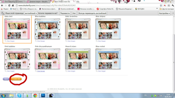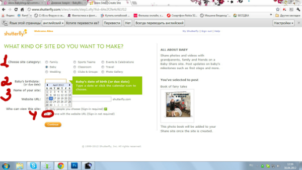 Выбираем тему книги, дату (можно изменить в любое время) рождения, видимость сайта (для всех или только для тех, у кого есть ссылка) и нажимаем Continue