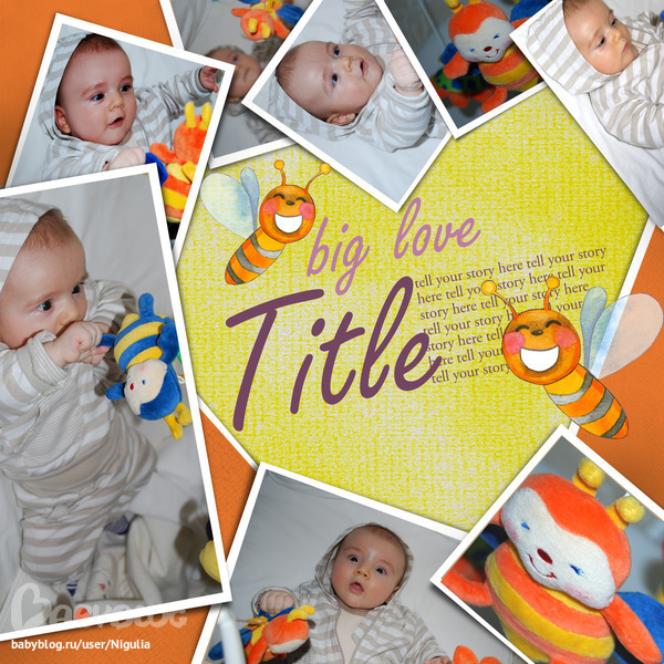 отличная страничка))))))))))))) только, Нигуль, вместо всех текстов надо написать свое))) вместо Титл - например "Пчелка" , биг лав - оставить можно, а вместо текста - рассказать про взаимотношения пчелки и сына) или как они с пчелкой играют, или еще что))) а так правда, очень ярко, классно)))