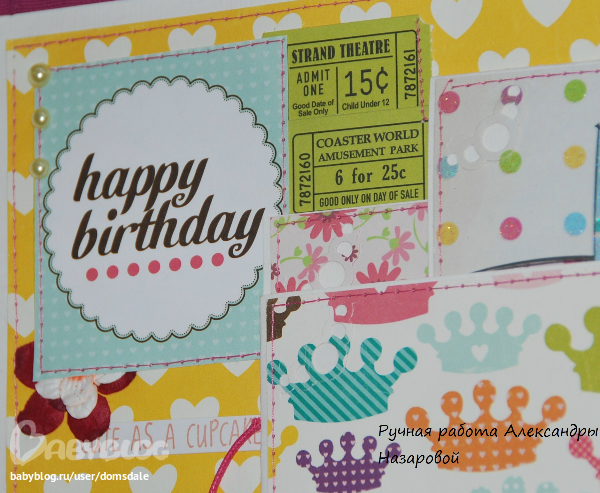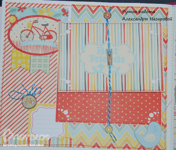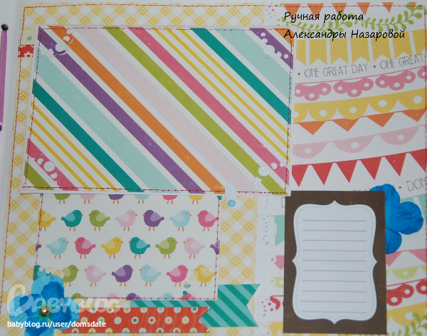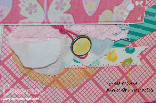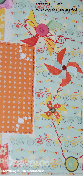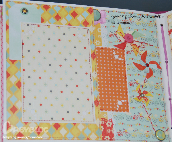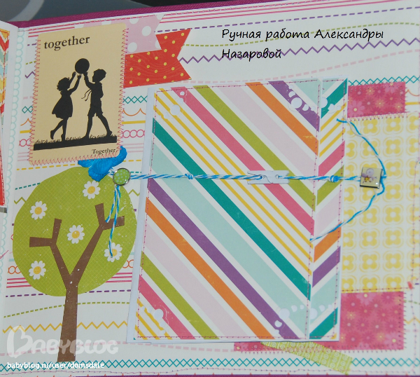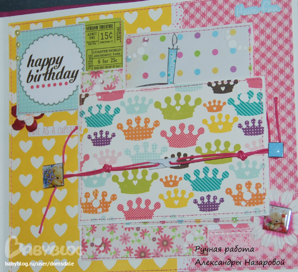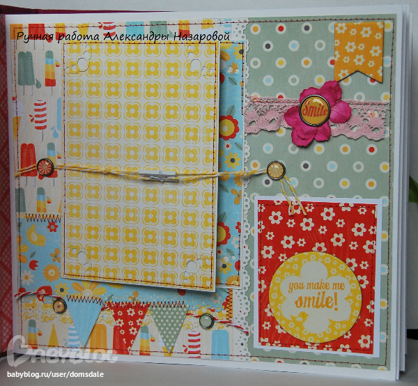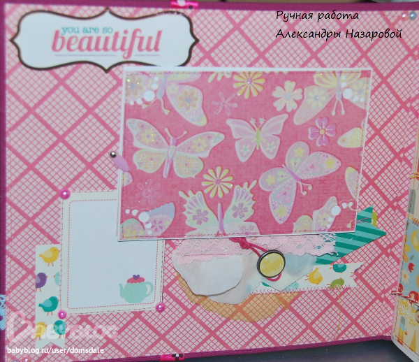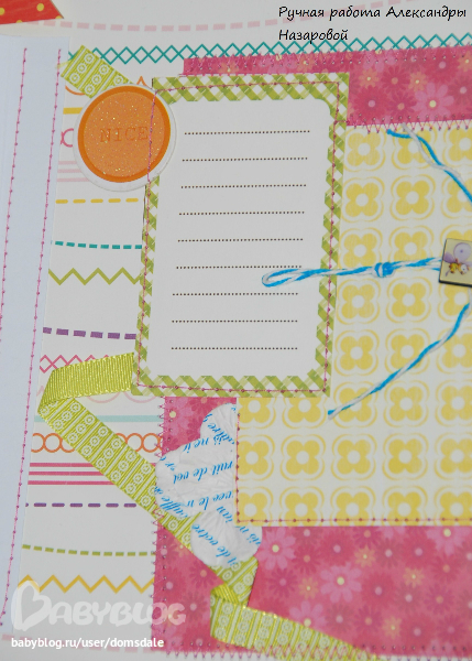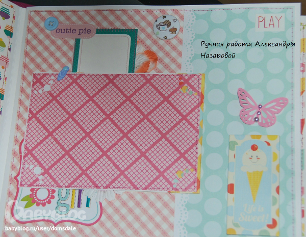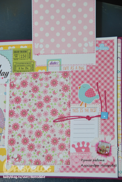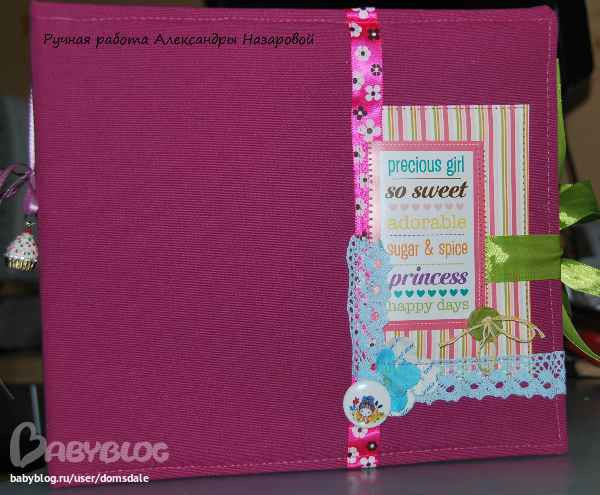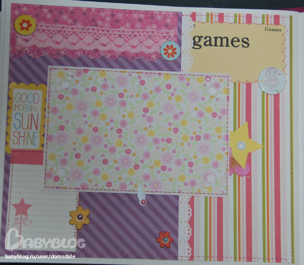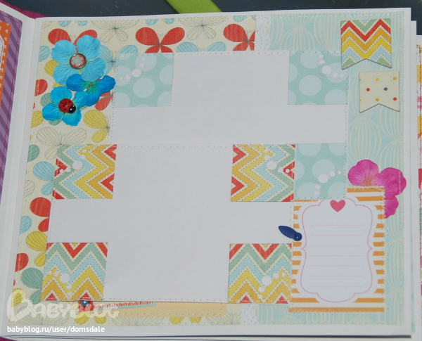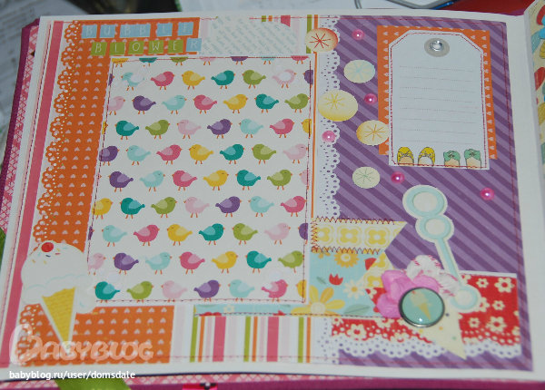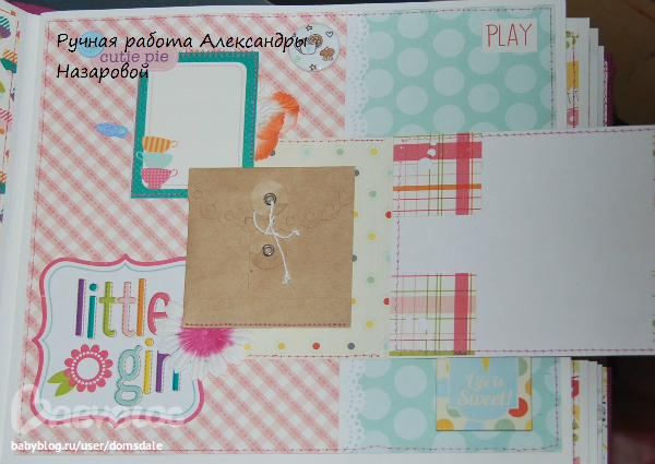 Итак сам альбомчик получился 23,5 на 26,5. 6 листов, 14 страниц. Всего в альбом вмещается39 фото, форматом 10-15, есть места для записей памятных событий. Имеется конвертик для секретика девичьего. Бумага MME и EP украшения и из коробки и из наборов)