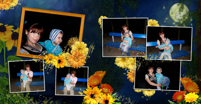 Вроде фэнтезийный скрап, но ребенок прямо совсем очень захотел эти фото с этими цветочками)) Посмотрите, пожалуйста, может что поменять (или вообще переделать(), а то я уже собсем заработалася с "этими блестящими цветочками". Что -то у меня они не клеятся)