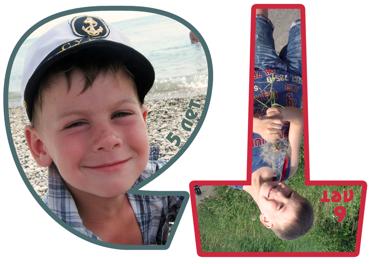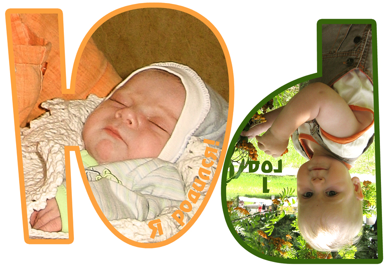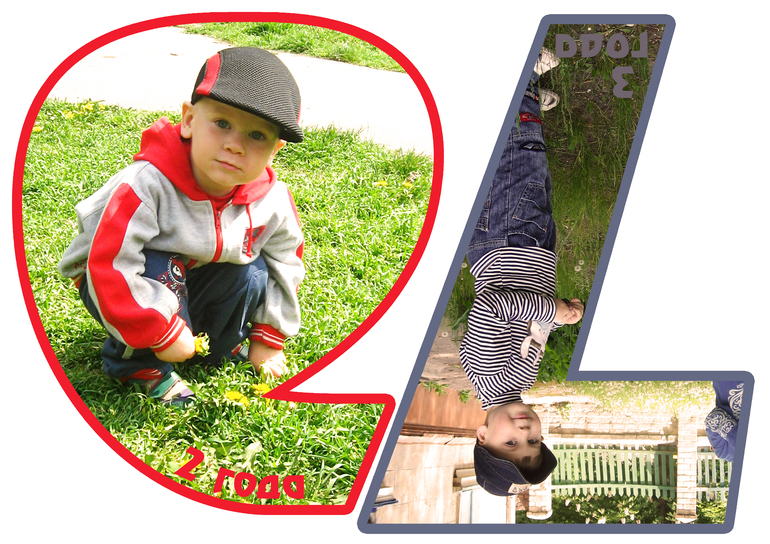 Шрифт AGRevueCyr, немного деформировала перспективой, расширив символы вверху. Ну и отверстия в буквах закрасила. Фото от рождения до 7 лет, разноцветная обводка.