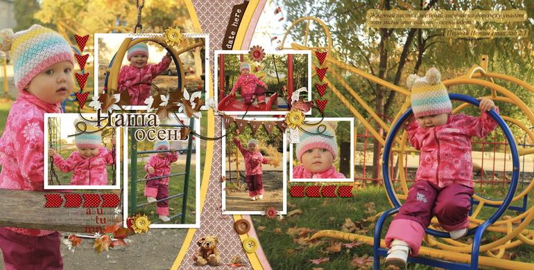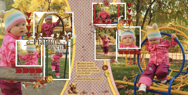 Первый разворот гармоничнее, но стих не читаем совсем.Понятно почему ты хочешь его сохранить. Только сделать это нужно по другому.Убирай обводку/свечение и попробуй "пристрочить" текст. Точнее добавь пристроченную бумажную полоску и на ней расположи текст.Плюс добавь листики от Натали, чтоб поддержать весь разворот.