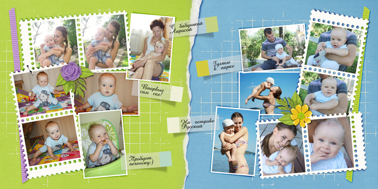 прочитала сначала 70- ый разворот)))) подумалось ОГО :)))))ФОН: бумаги поменять местами, голубую слева, зеленую справа, иначе они сливаются с фотографиями на нихЭЛЕМЕНТЫ: к детскому развороту детские бы элементы конечно лучше... игрушки и т.д. Цветы обратите внимание — они размером с голову ребенка, в напечатанном виде будет нереально огромно смотретьсяТЕНИ: сделать объемнее и светлее на порванном срезе, со стикерами чуток размыть — больно четкиеФОТО: нет цветокоррекции даже минимальной...правые фото — у ребенка нереально синит лицоА в целом симпатичненько :) Егор в любом случае оценит мамины старания лет через надцать ;)