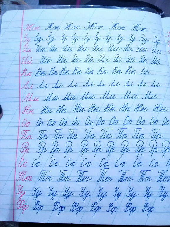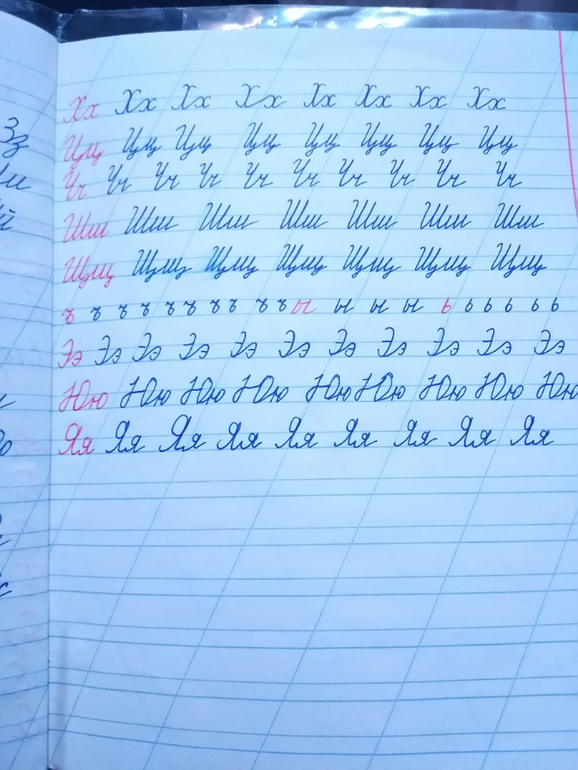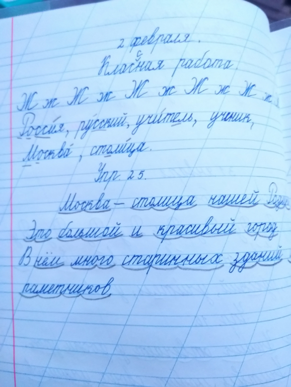 В начале года и на подготовке она растягивала буквы. Но , сейчас стало гораздо лучше. Так как они много пишут. И диктанты и списывания+ на дом задают писать.