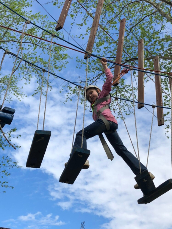 Напоследок ездили с классом на базу в Манки парк. Я сама всегда боялась высоты, меня не загнать было на аттракционы подобного плана. Вероничка явно не в меня пошла, рвется на все такие штуки, но ее мало где пускают, по росту не подходит. Мелкая она у нас, 3 с конца в классе. В нашем ближайшем парке такая трасса рассчитана на детей с ростом от 140 см, а моя только до 130 недавно доросла. А в центральный парк, где есть несколько трасс, не наездишься часто.