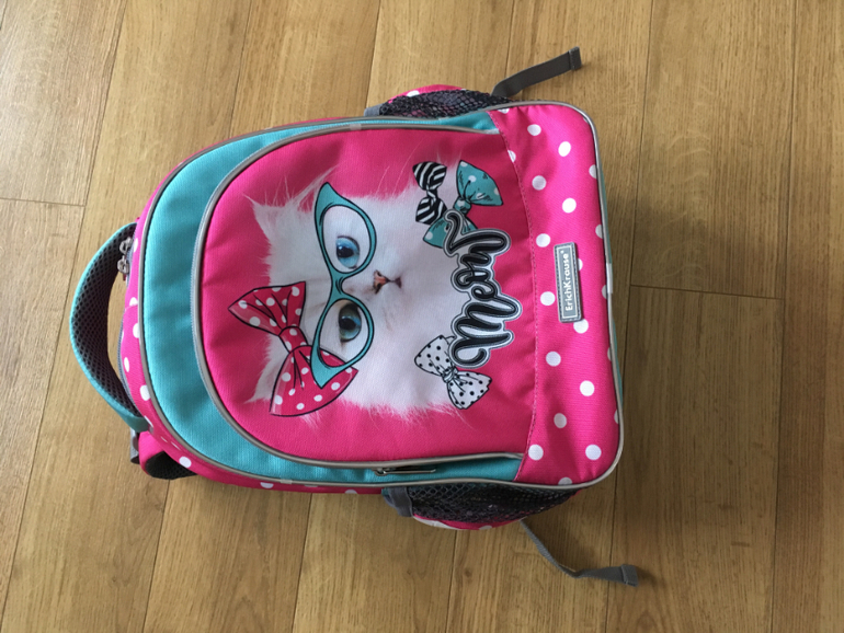 Ну и вот этот, который мы в итоге и оставили 480 гр! Дно в виде клапана, твердое, пожно поднять либо опустить. Рюкзак стоит и не падает. Внутри широкая резинка для фиксации учебников. Кармашек на молнии и 2 кармашка для салфеток и телефона. Спереди еще один карман ( где кошка нарисована). Сбоку 2 сетчатых кармашка, для воды и чего-нибудь еще.