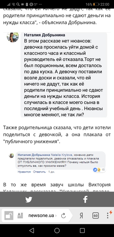 "Торт не был порционным, всем досталось по два куска. А девочку поставили возле доски и сказали, что ей ничего не дадут, так как ее родители принципиально не сдают деньги на нужды класса", - объяснила Добрынина.