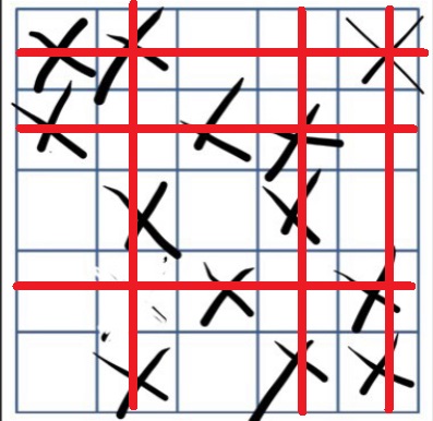 А она решаема? 3 вертикальными и горизонтальными линиями можно зачеркнуть 21 крестик из 25.