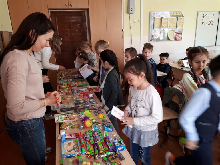 Первый класс. Не про вещи.Все заработанные плюсы по итогам первого класса превратились в смайлики,которые можно было потратить на ярмарке.