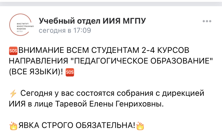 У меня дочь студентка МГПУ, 2 курс. Сегодня 11.10.2020, в воскресенье их созвали на экстренное онлайн собрание.
