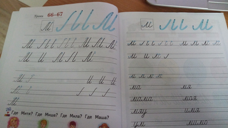 ..По математике сразу узоры мелкие и тоже нормально, более того сыну подруги сразу в этих клеточках зайчиков и чебурашек и тд рисовали и их надо было повторять - сидел и повторял как родной. Ну, конечно, у них в школе практики маловато, я свою заставляла писать еще дополнительно, но не по многу - так несколько строчек. Важно, чтобы ребенок писал в тетради в частую косую линейку обязательно (прописи, конечно, никуда не денутся, но и частая косая линейка быть должна)..Причем мы сразу в мелкой писали, я даже и не знала о том, что существует укрупненная, ну и пишет класс не ужас - ужас совсем, некоторые девочки так вообще очень хорошо... У меня больше вопросов с научением писать не в плане почерка. Тут мне кажется, что школа особо не учит..Либо есть, либо нет, но это, кончено, меня не устраивает.. Собираюсь с силами доучивать сама..