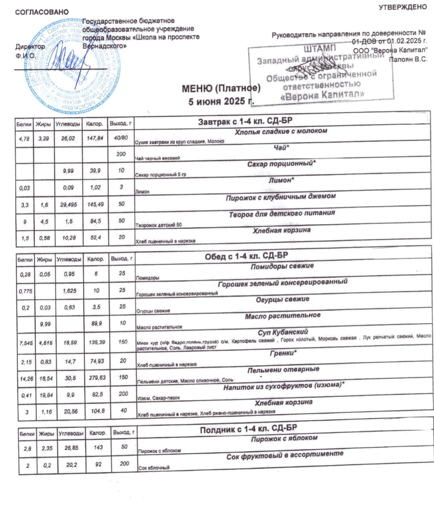 Пример меню на день. Наверное он во всех школах примерно одинаковый.