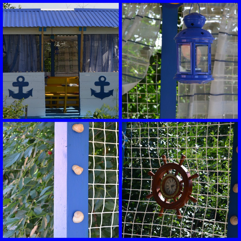 А это моя гордость.Эти летом муж построил беседку, а я воплотила морскую тематику в жизнь.Красила, шила шторки, подбирала декор....