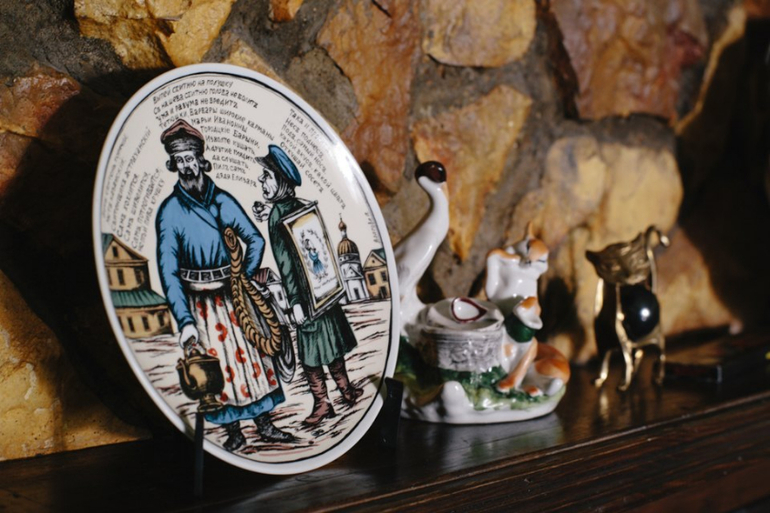 Большая часть мебели в доме ХIX--XX веков, собирать их помогал вологодский коллекционер Михаил Суров. Часть шкафов покупали в обычных магазинах, потом снимали с них двери и ставили те, что находили в деревнях. Помимо старинной мебели, в доме много ремесленных изделий и неканонических икон.