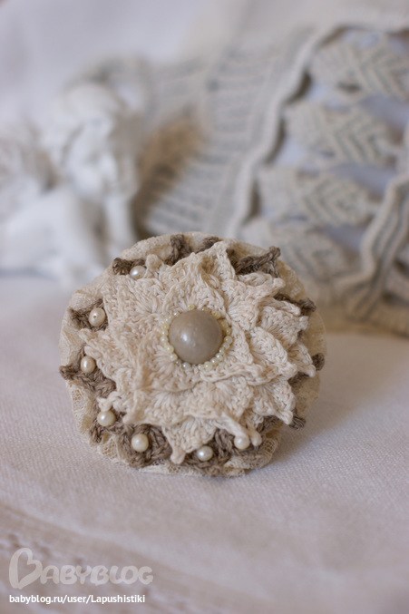 Мне нравится комбинировать самые различные материалы и нитки. Мягкий хлопок очень хорошо гармонирует с более грубым льном. Такие комбинированные броши с использованием текстильного кружева смотрятся очень красиво и нежно.