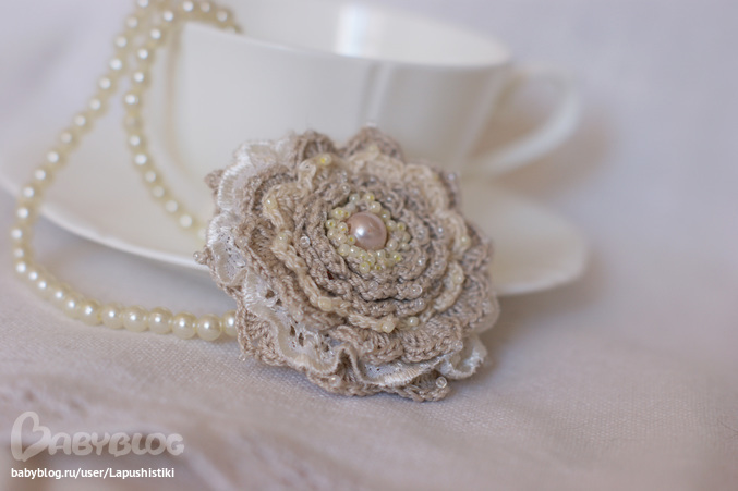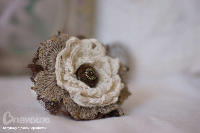 Данную брошь я связала из льняных ниток. Вообще в своих работах я стараюсь придерживаться натуральных материалов. Очень люблю вязать из льняной и хлопковой пряжи.