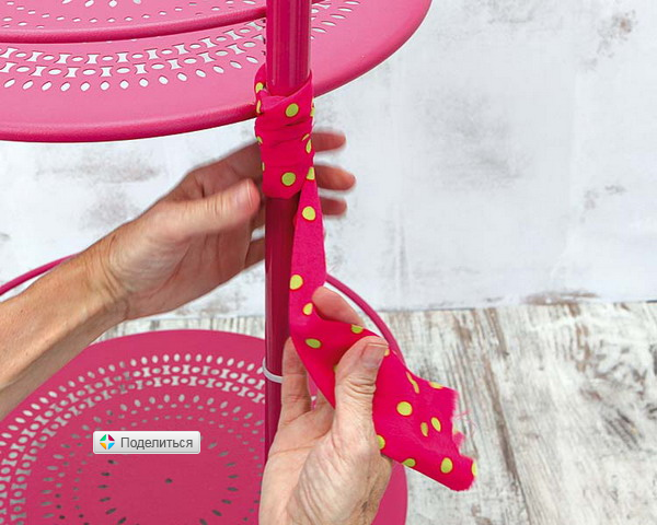 Вам потребуется: пляжный зонтик яркого цвета, ткань в тон зонтику с рисунком (например, в горошек), шелковая бахрома (измерьте окружность зонтика, чтобы рассчитать количество, скорее всего, получится около 3 метров), бумажные гирлянды, ножницы, нитки, иголки, резиновые фланцы.