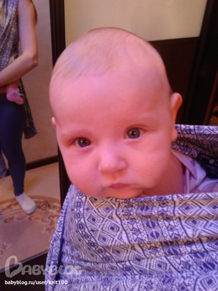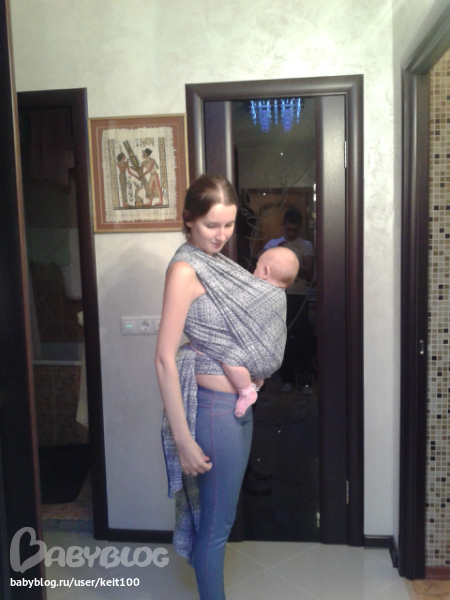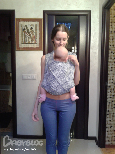 Учимся носитьДнем опять ничего не вышло, пошли гулять с коляской, вечером пересмотрела еще раз видео , вот что вышло, мне кажется что уже лучше=) но вот Алиска у меня сверху не прижата, отталкивется ручками, так можно или надо плотно ее прижимать? что опять не так?