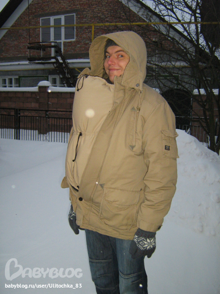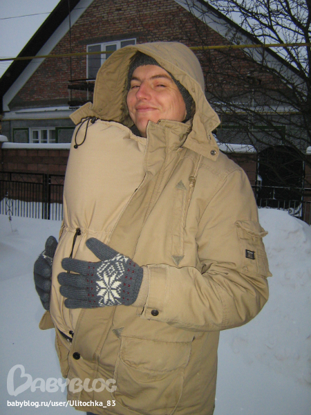 Кстати очень довольна, что купила себе слингокуртку и мужу вставку смастерила, они сейчас как никогда пригодились... у нас замело и с коляской явно не пройдешь на прогулку.