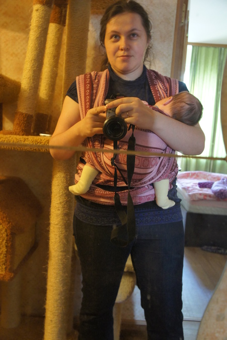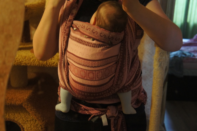 Слинг-шарфКупила себе слинг Ellevill Zara Tricolor Sugar 100% хлопок, очень красивый цвет. Сначала мотала и дома носила Аню хоть по 40 минут, чтобы привыкала. Она в принципене протестовала, а через минут 15 сразу засыпала. Но он конечно жаркий ппц...если дома..больше часа не относить. Сегодня вышла в нем к паспортистке, идти недалеко, решилась. А дома сфоткала, как выглядело. Нам 2 месяца. Дай бог будет он у нас популярен.