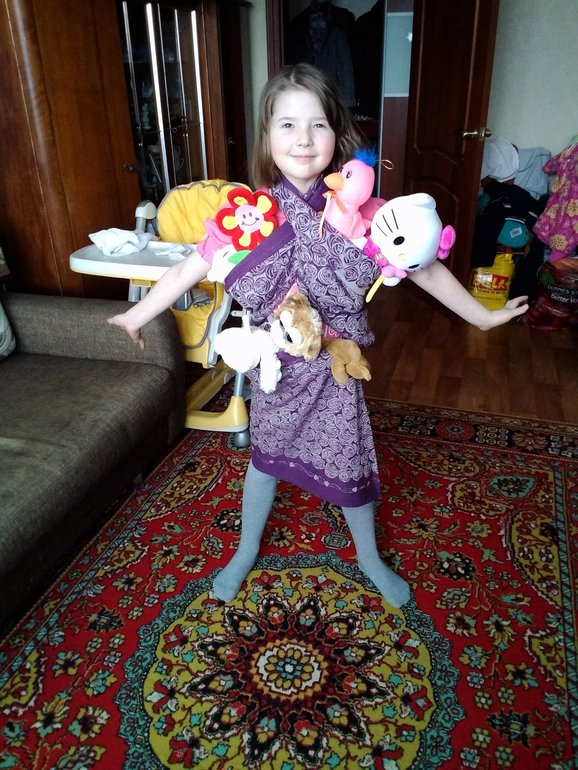 Вот что имеем на сегодняшний день, а пенсия наступает на пятки, т.к. дочка полюбила гулять ножками. Но пока бывают приятные моменты, когда она тащит шарфик и зарывается в него носом)))