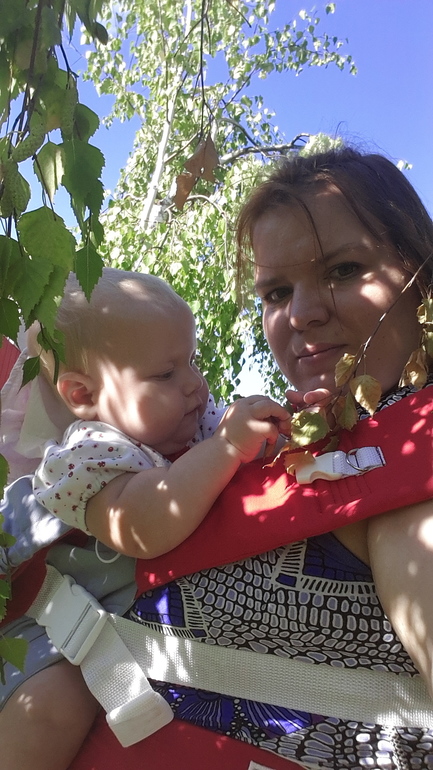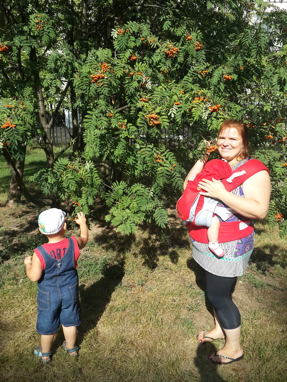 красивый, правда? естественно, первым делом прийдя с почты я попробовала замотаться. Надо сказать, что это получилось на ура...а поскольку мой старшенький тестирует ВСЕ без исключения, предназначенное для младшей, то и его 23 кг слинг благополучно выдержал:)самые первые фотки я уже не найду..поэтому просто несколько фоток с прогулки:)