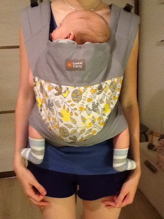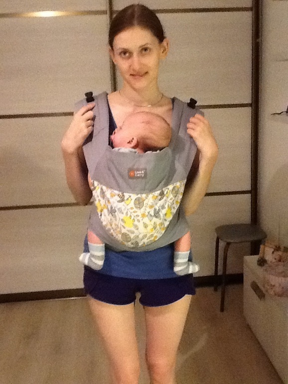 Колени на уровен попы, таз плохо отставлен, нет поддержки верхней трети спинки, смущает этот пузырь ткани по всей спине малыша.Нужно хорошенько и максимально тщательно подтягивать лямки, насколько это возможно вообще в этом май-слинге. Попробуйте сделать перекруты лямок на плечах, это немного подтянет вверх колени и прижмет верхнюю треть спинки.Лямки выводите из-аза спины высоко и аккуратно расправляйте в районе лопаток малыша, затем уводите так же высоко за спину. Это немного прижмет плечики малыша к Вам.Ширину спинки стоит подстроить под малыша, опять же. насколько это возможно. Пока ножки слищком широко разведены, таз прижат.