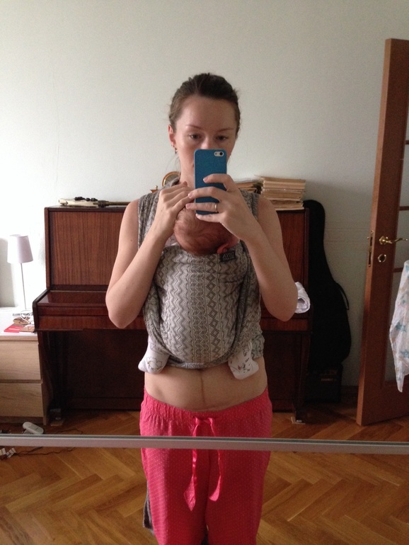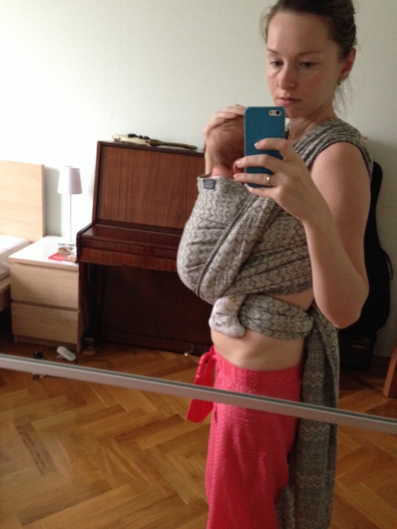 Всё хорошо )Для поддержки головы можете заложить валик под шейку. Просто вытягивайте ткань до затылочка. но оставляйте в районе шеи малыша. В ткань слинга положите скатанное в валик маленькое полотенчико, и заверните "лишней" тканью слинга.Получится валик в ткани слинга под шеей малыша.