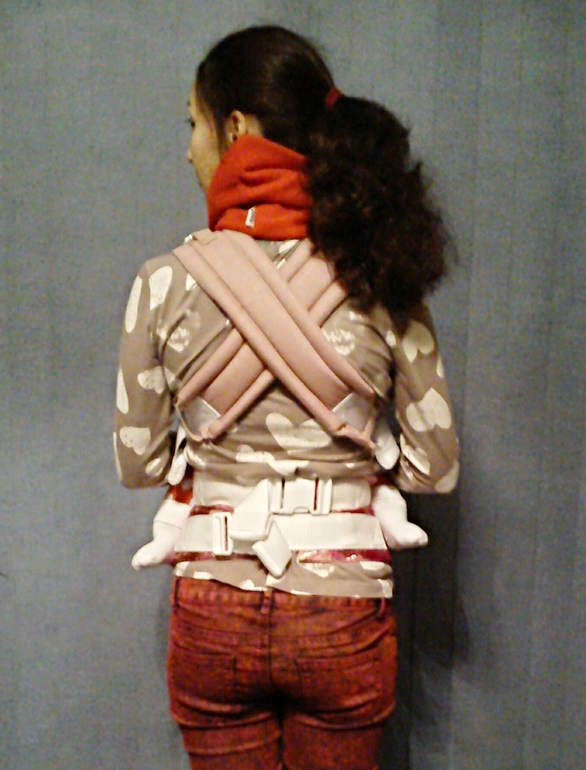 Сильно перетянули фастексы на спинке, она не скругленная, а прогнутая в середине. Для ребенка такого возраста (раз уж вы рискнули) это критично. Чтобы натянуть плотнее лямки, вам нужно не утягивать идущие со спинки ребенка, а застегнуть свои, еще раз их как бы перекинуть по плечам за спину и подтянуть. И заодно отодвинуть их от шеи и опустить перекрестие как можно ниже)) И еще, мне кажется, ножки переразведены.