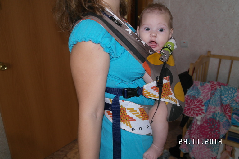 Вот такая посадка мне больше нравится, чем предыдущая. Таз отставлен, плечи прижаты, есть поддержка до самой шеи. Спинка не перетянута.Ножки вертикальны, как я понимаю, когда малыш ими не болтает.Можно придраться к ширине спинки — возможно, чуть не хватает от коленки до коленки, или же взять малыша за голени и чуть свести ножки вместе. Возможно, этого будет достаточно, чтобы ширина спинки была как раз.И смотрите, не врезаются ли лямки в плечи? Если врезаются, то расправить нужно или проложить уплотнителем.