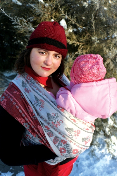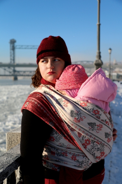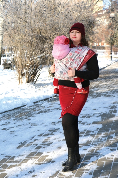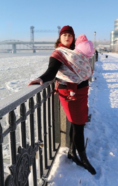 Мне, привычной к хлопку, оказалось непросто найти общий язык с шарфиком. Из коробочки он был скользкий, прохладный и абсолютно непокорный. Приручала я его, приручала, мотала, мотала, косы плела... , наконец, раскрылся он мне. Шарф оказался рыхлый, довольно держучий и очень-очень прохладный. Жарким ростовским летом выручал нас не раз. Немножко сноровки в намотке, и несет он 10,5 килограмм, несет и не жалуется.