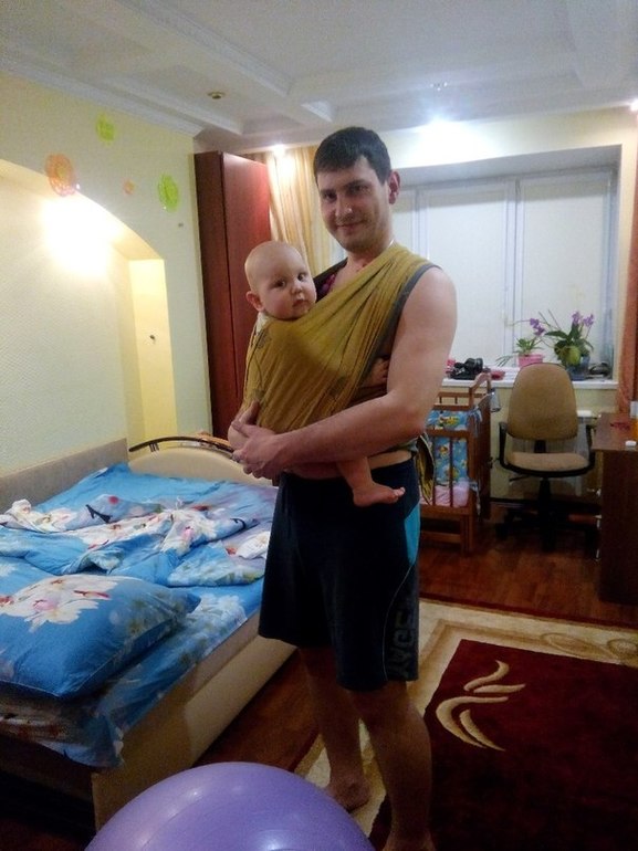 Слинг и папаУшла я в душ, выхожу, а там вот такое чудо))И еще возмущался, что это я психовала, когда училась наматывать, типа тут все просто)))