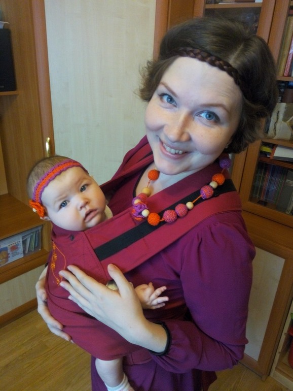 Цвет слинга понравился ещё при первом знакомстве, на сайте Модамам. Ну, а вживую окончательно влюбил в себя. Тут же захотелось связать повязку и бусы под цвет. Вдохновение в действии!!!