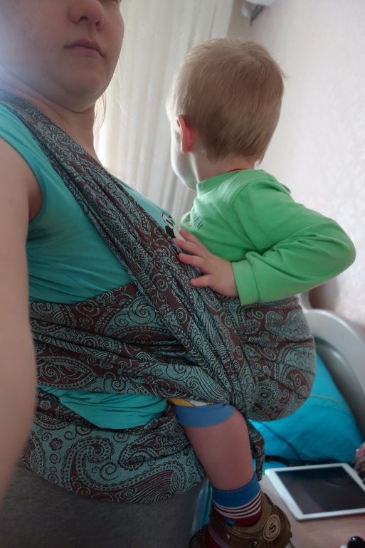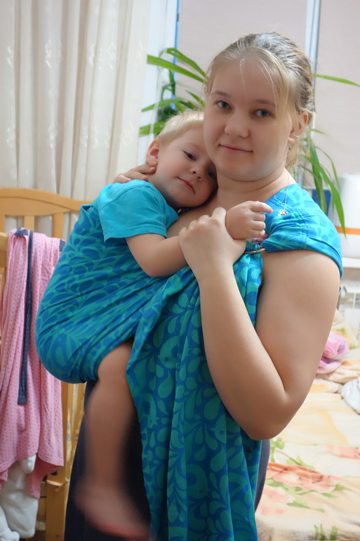 Учимся носитьСлинги покупала, чтоб носить младшую дочку (её 3 мес), но пока она носиться на маме не захотела. Зато старшенький на маму теперь любит залезть. Ну, решила пока на неё и научиться мотаться. Посмотрите мои первые намотки, пожалуйста. Сыну 2г5мес, почти 14 кг веса. Мотаться ужасно неудобно - одной рукой я его уже не удержу, поэтому с подтягиванием большие проблемы. В принципе, есть эрго для сына, но ему понравились слинги))) Конечно, намоталась плохо, но уж очень тяжело ((( подскажите, на что обращать внимание. (в сск сама вижу, что попа почти не просела). А в сш похоже на гиперразведение, нет?)