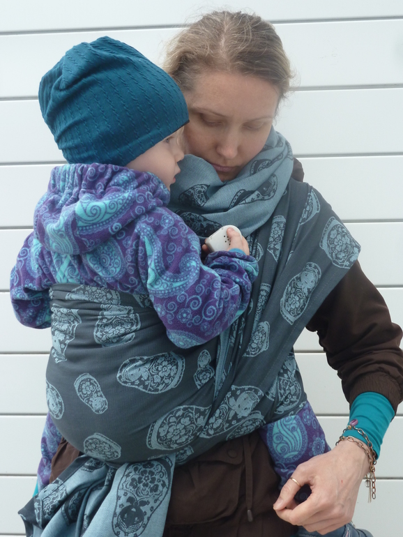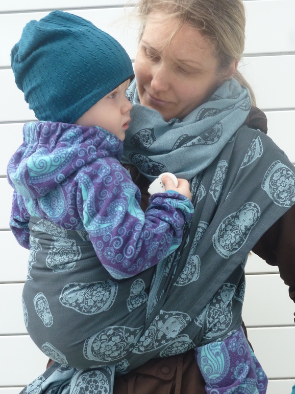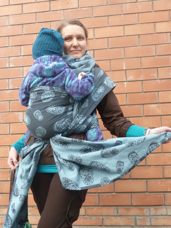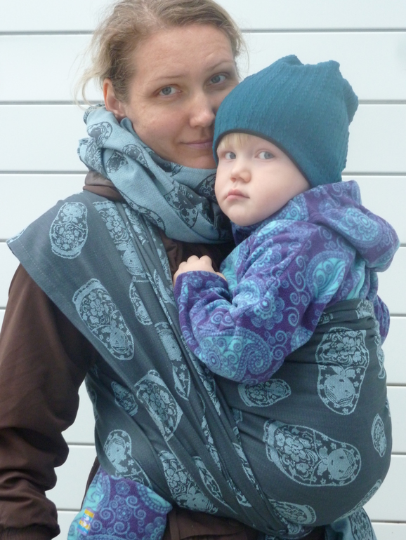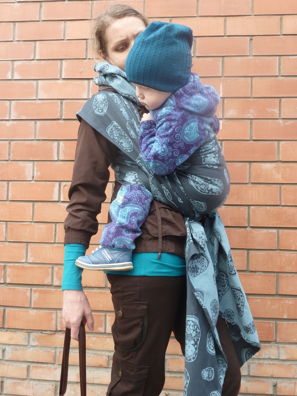 Шарф ближе к тонким, требует тщательной намотки.Компактный, мотается экономно. На сайте заявлен как грузовоз и не разочаровал, несёт отлично! Выгуливали детёныша 17-ти кг в усечённом КНК, спина не пикнула)