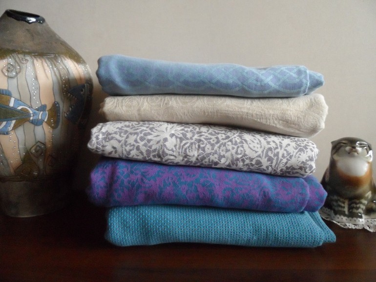 К шести месяцам у меня успела собраться и уже несколько раз поменяться небольшая, но все-таки стопка) В ней одновременно находится не более 6-7 шарфов, добрая половина которой - Diva Milano. Это не маньячное количество, но все носить все-равно не успеваю. По практике - 3ех шарфов одновременно более, чем достаточно. Как правило, выбираешь себе рабочую лошадку и не вылезаешь из нее. У моих шарфов наблюдается разделение по функциональности - что-то носится на улицу и в люди. А что-то дома - для засыпания и глажки, ибо борщи я перестала варить в слинге. А вот Гарда каким-то непонятным образом используется и туда и туда.