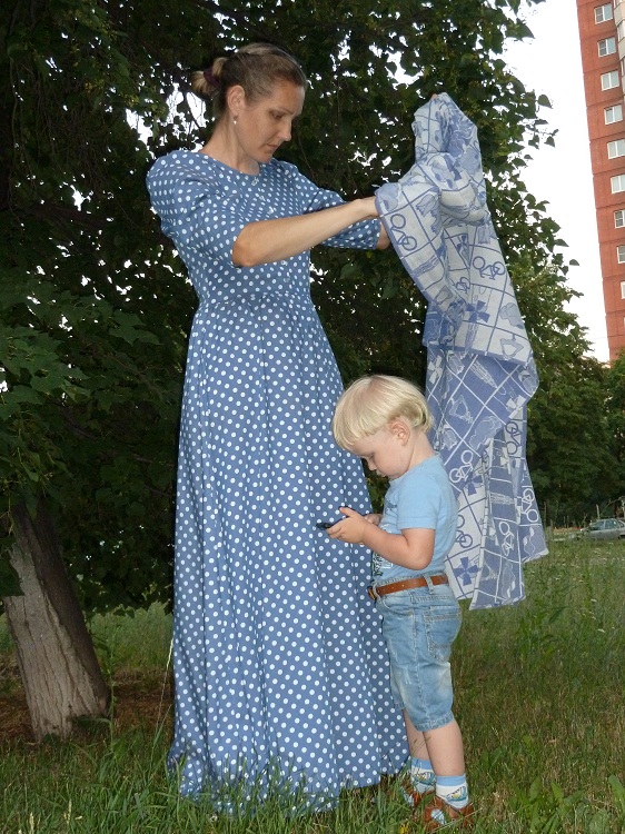 Джинса бывает и нежной. Платье из облегчённой летней джинсы в пол, детёныш в джинсовых шортах, слинг яро, из аксессуаров жемчуг.