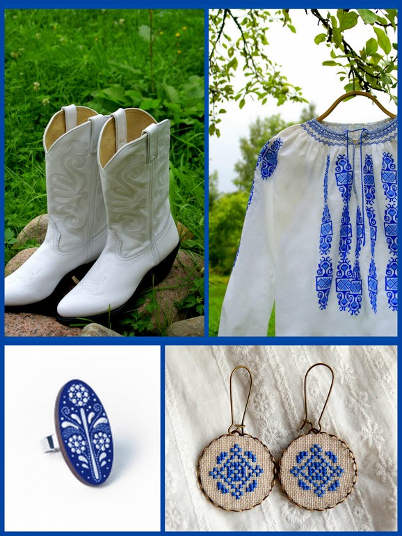 На мой взгляд, образ получился немножко ретро - коктейль на базе классических джинсовых прямых брюк с добавлением "ингридиентов" со всего света. Прежде всего любимая вышиванка, которую я "откопала" на финской барахолке (судя по этикетке, вышивали ее в Китае), белые настоящие ковбойские сапоги из Штатов, и приправлено все это аксессуарами ручной работы из Словении и Венгрии - серьги с вышивкой и деревянное колечко с ручной росписью. Я обожаю выискивать интересные аксессуары ручной работы по всему миру!