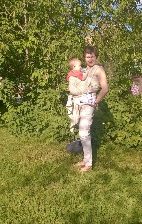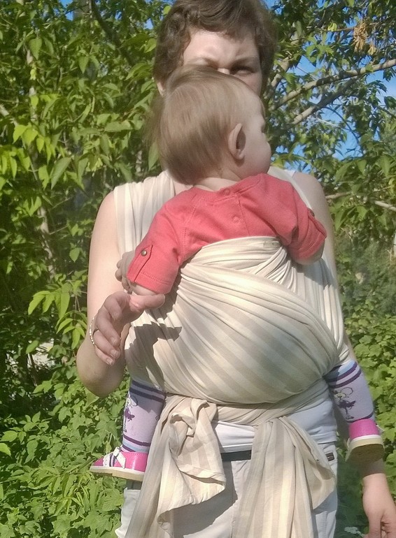 На следующий день мы пошли выгуливать шарф. Прогулка длилась часа три. Слинг вел себя хорошо: не врезался никуда, намотка не ползла, детка не провисла.
