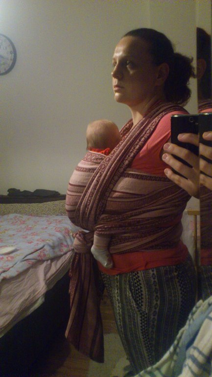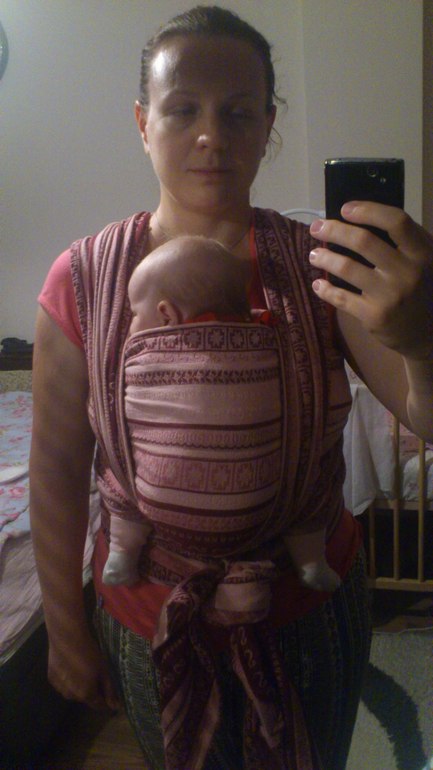 Ну и по спине (по твоей) расправлять полотнища слинга, прям тяни их вниз, до самой талии, тогда нагрузка будет по всей спине идти.А может кстати, уже и в трехслойной намотке носить? Будет легче. Но так жарче, конечно.И еще один момент: узел лучше завязать на спине( чтоб он был выше, чем попа у ребенка) а потом оставшееся уже выводить вперед.
